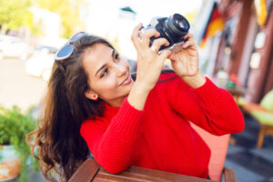 Enthusiastic long hairs woman looking up, making picture, enjoying amazing architecture in old European city. Spring or fall season. Cozy knitted red sweater. Sunny weather. Warm colors.